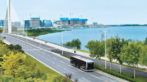 ▲河南省郑州市郑东新区自动驾驶公交1号线车辆行驶在试运行的道路上