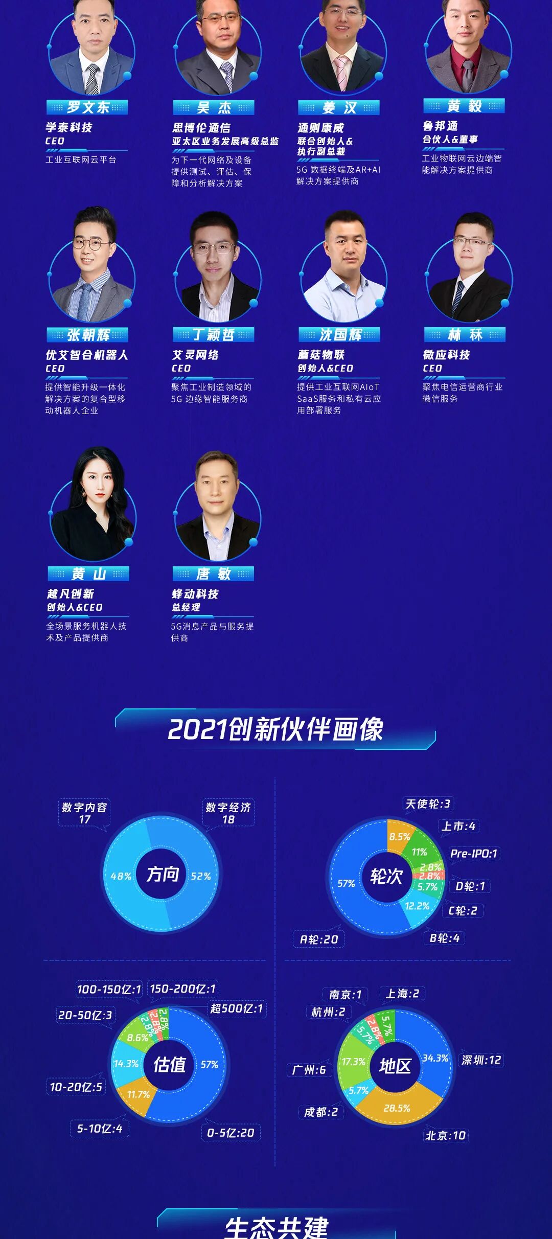 35家2021创新伙伴,覆盖了工业互联网、智能交互、虚拟/增强现实、未来网络等12大5G场景,总估值近1000亿元,其中数字内容和数字经济分别占比48%和52%。在城市分布上,深圳排名第一,体现了深圳在5G创新的活跃和领先。北京、广州分别排名第二、第三。融资和估值上,创新伙伴以A轮和B轮创新公司最多,也涵盖多个估值百亿的龙头企业。