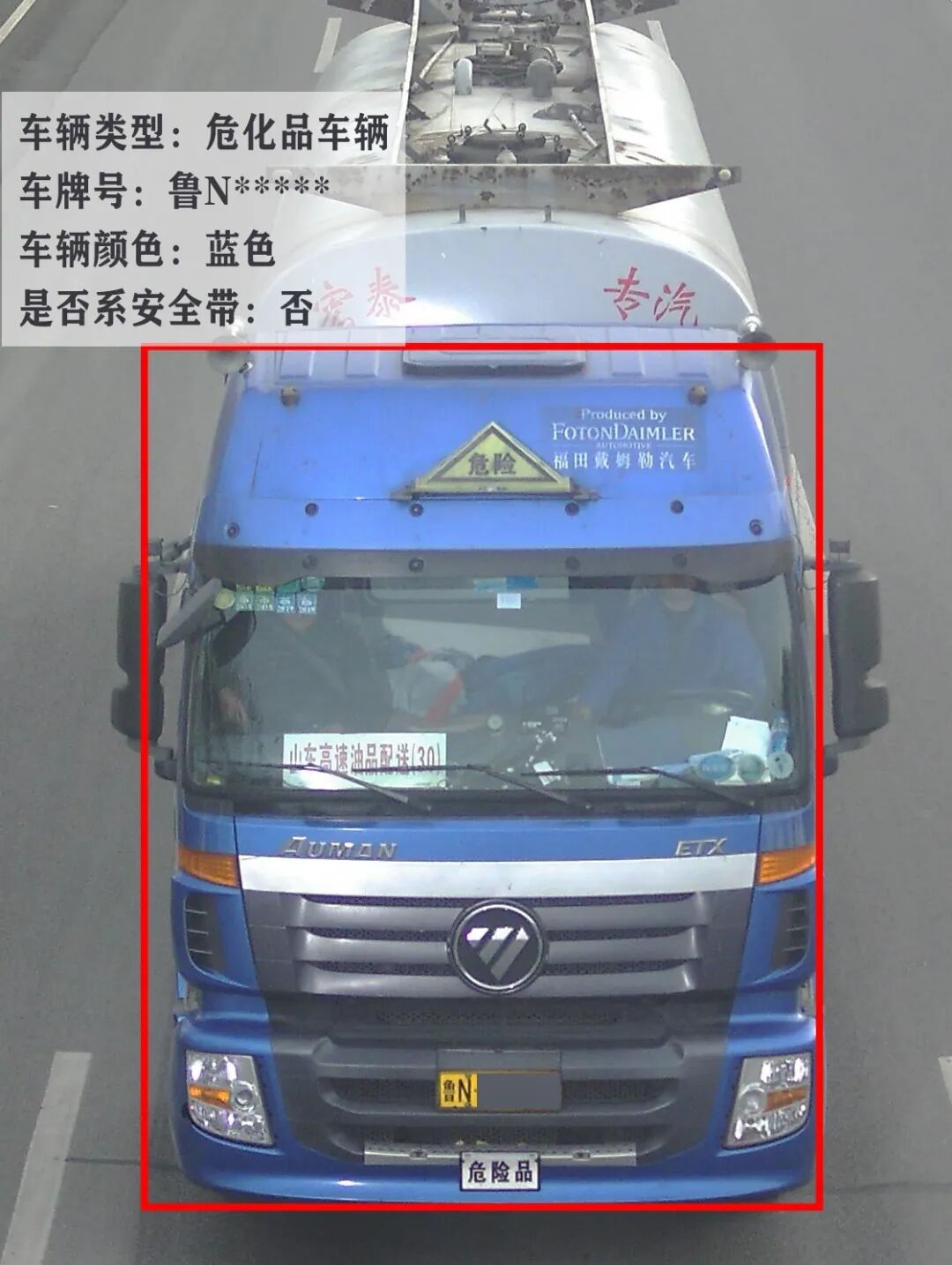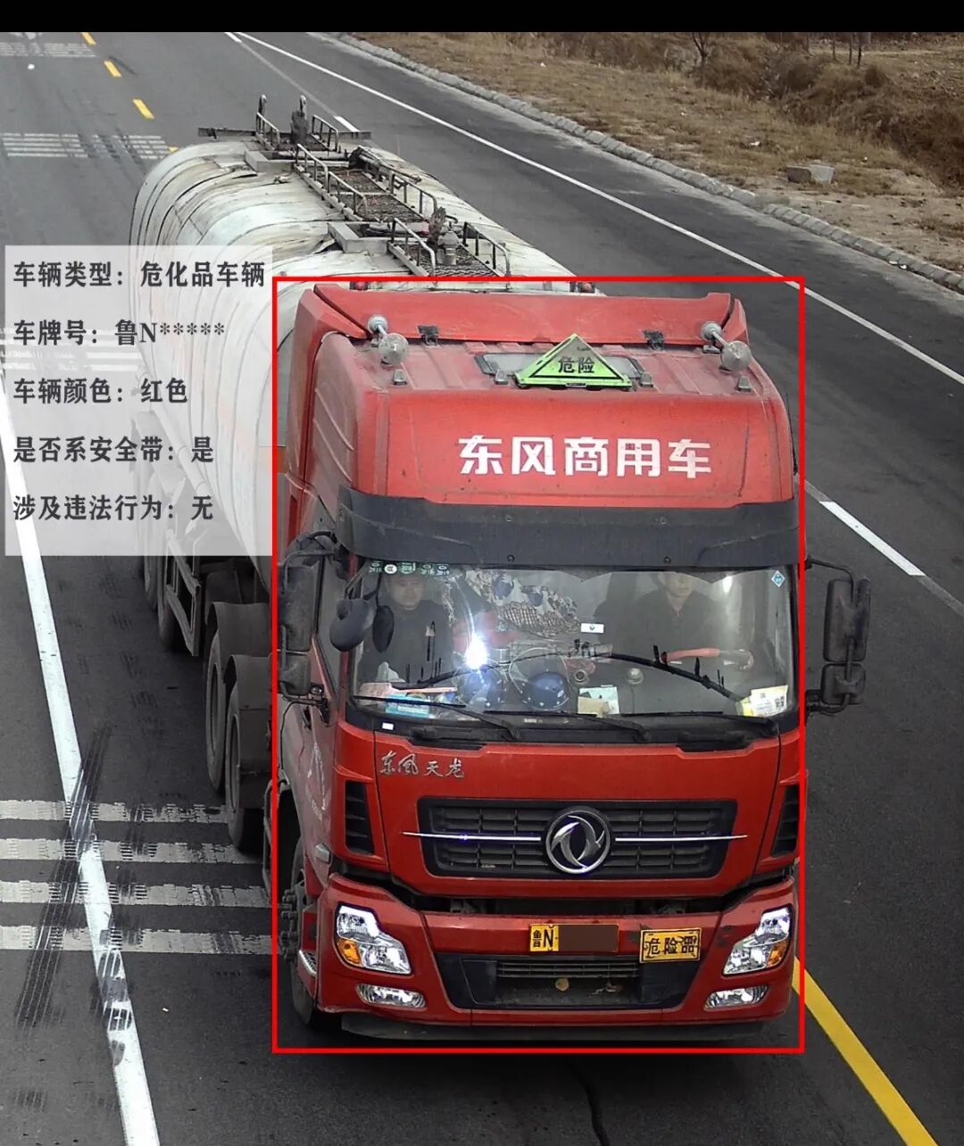 通过大数据平台数据比对,实现危化品车辆驾驶员开车打电话、不系安全带、违反年检及报废规定等违法功能的检测识别、筛选、车档比对、图片合成,并自动上传执法审核平台。