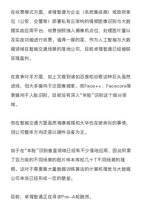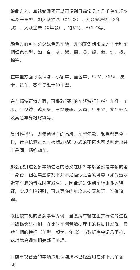36氪曾在2017年2月报道过卓视智通。该公司的主要业务是把计算机视觉技术应用在交通、安全及其相关垂直行业,提供人与车辆的精细化识别、大数据应用“云+端”整体解决方案。